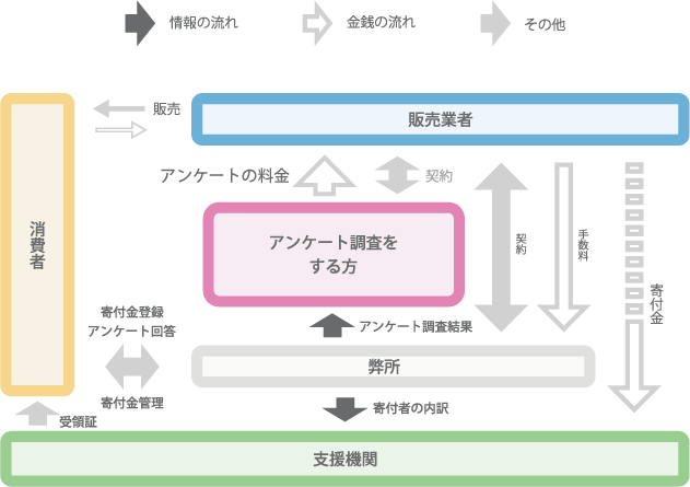kiff(キッフ) キャンペーン・サービスは弊所と販売業者(主に通信販売業者)と契約を交わし、寄付金の送金やアンケート調査を実施します。